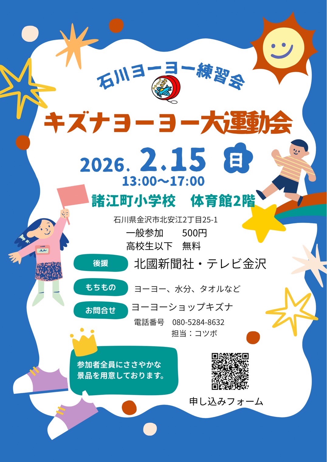 第一回キズナヨーヨー大運動会 〇日時 2026年2月15日(日)13:00~17:00 〇会場 金沢市立諸江町小学校(体育館2階) 〇参加費 一般参加:500円 高校生以下および見学:無料 〇主催/後援 〇スポンサー(順不同) Admiral 様 LEAD 様 戦国 様 Icarus Project 様 Popping YOYO 様 愛西ヨーヨー練習会 様 盛岡ヨーヨークラブ 様 のきさき 様